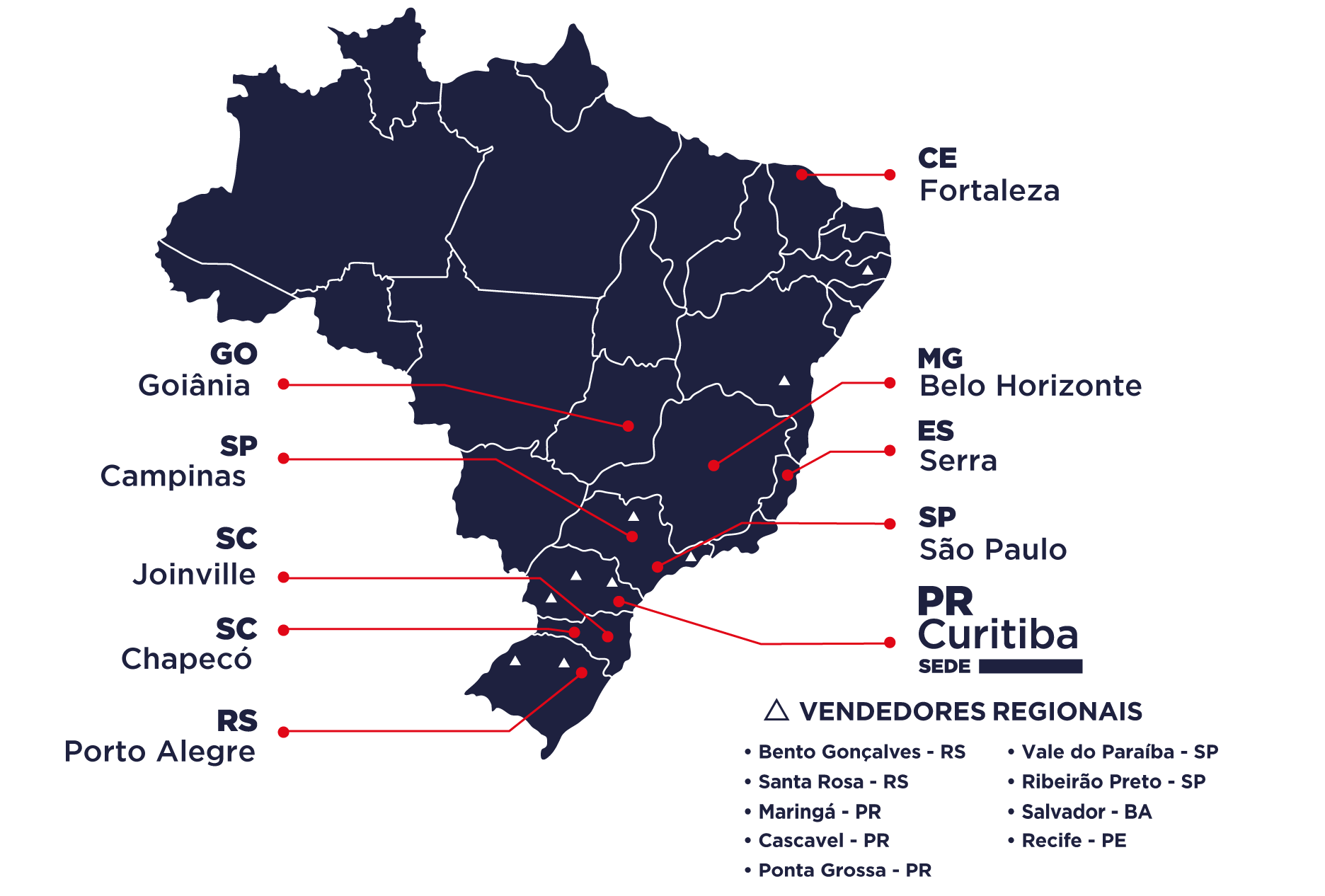 Nossa sede está localizada na cidade de Curitiba-PR e filiais temos filiais distribuídas nas cidades de Belo Horizonte-MG, Campinas-SP, São Paulo-SP Chapecó-SC, Fortaleza-CE, Goiânia-GO, Joinville-SC, Porto Alegre-RS e Serra-ES.